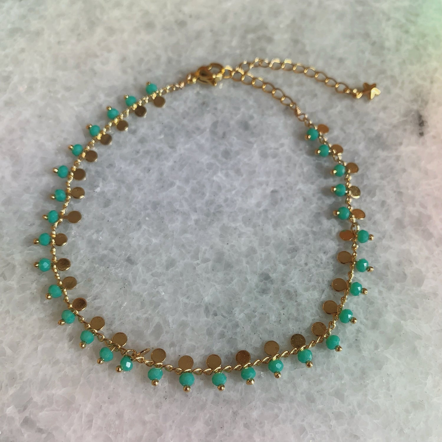 Colorful evil eye charms and gold rounds are hung from a goldfilled chain to protect you wherever you go!