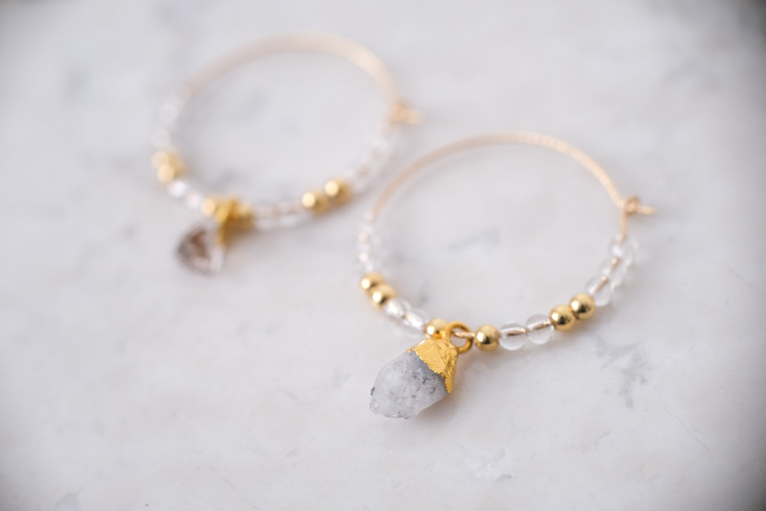Cute little herkimer diamond nuggets hung from 14k goldfill hoops. The hoops are beaded with quartz and gold accents.