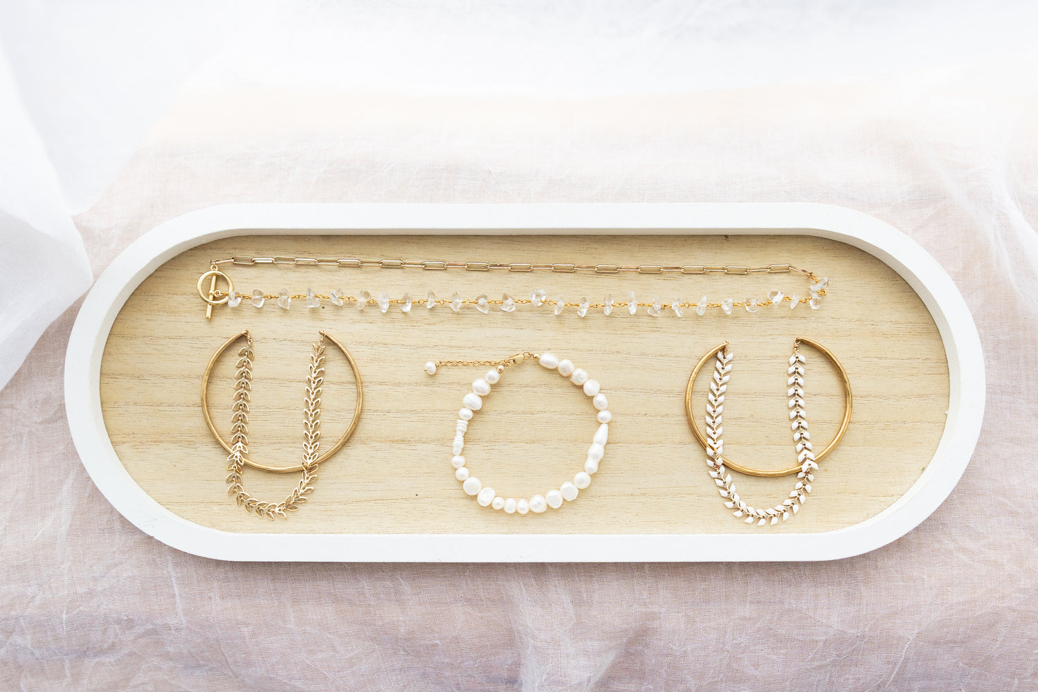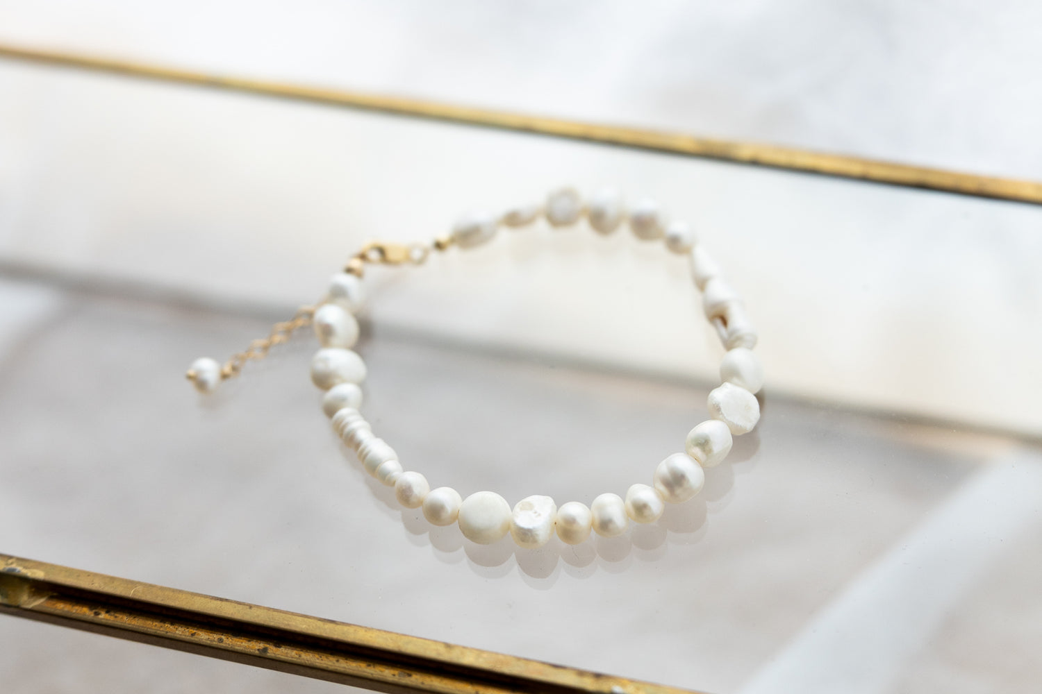 A mix of different size and shaped freshwater pearls along with 14k goldfill chain and clasp make this gorgeous bracelet that stands alone or fits beautifully into your stack!