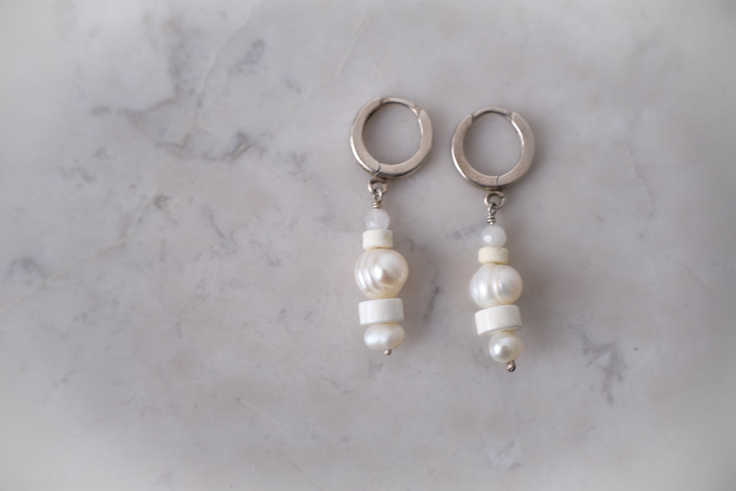 Pearls and howlite beads are strung from sterling silver hoops