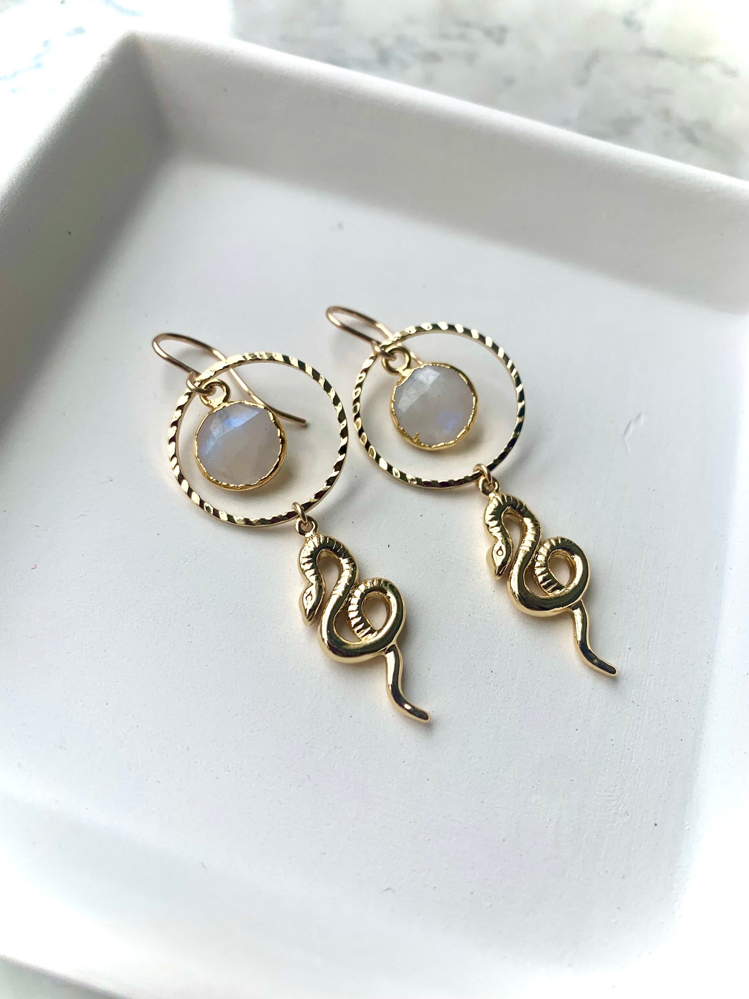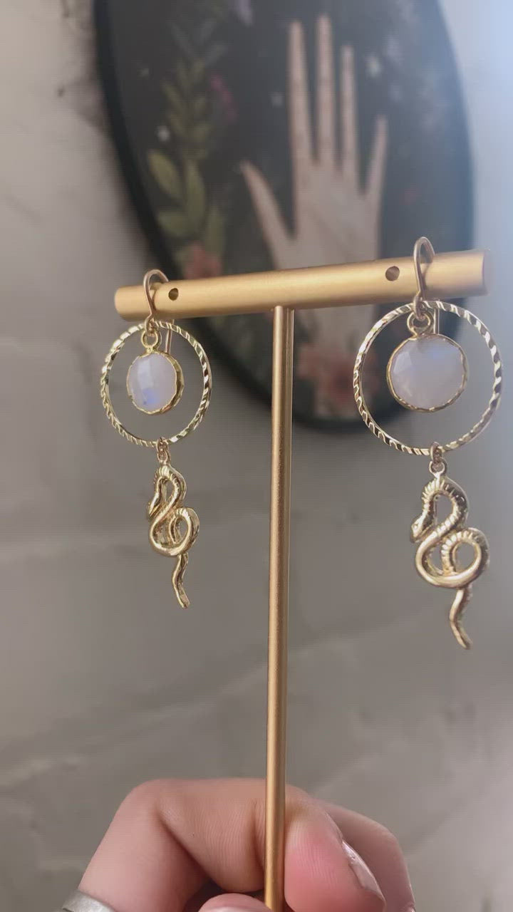 Adorn yourself with these protective earrings made of moonstone rounds and golden snakes!