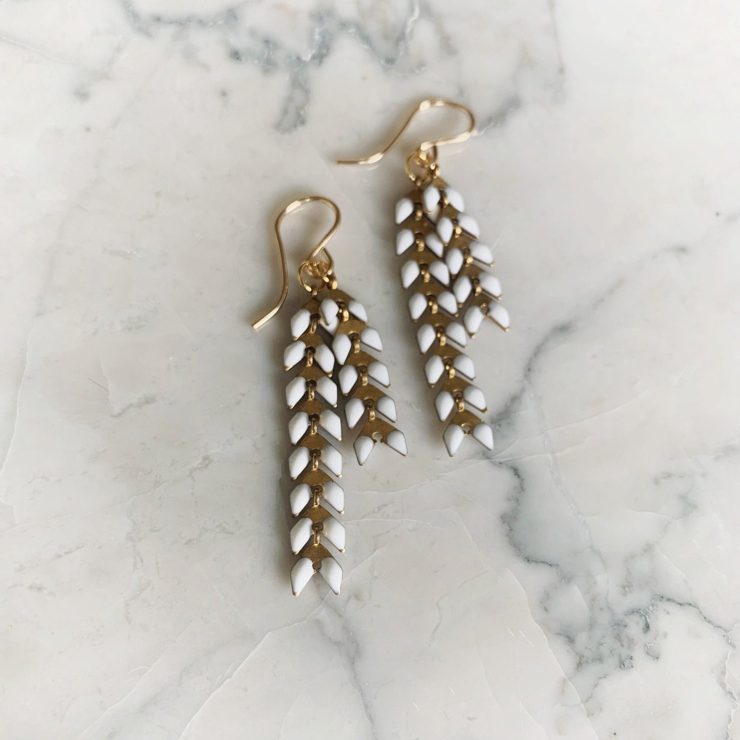 Featuring two white enamel chevron chains hung from a 14k Goldfill wire.